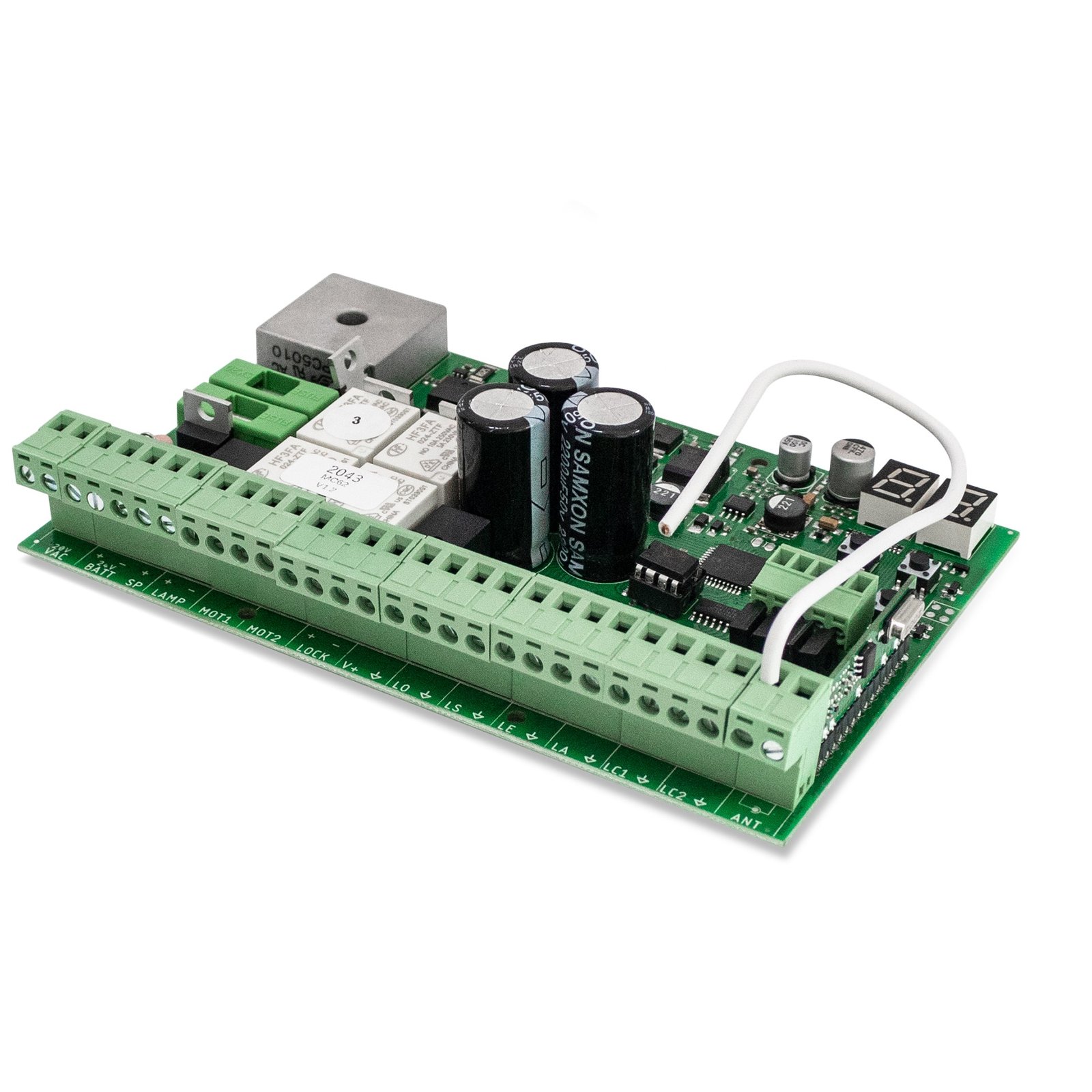 - Inputs for 2 pairs of photocells with different functions, such as 2 sec. inversion, stop or inversion, opening button, closing button, pedestrian, rotary button (open and close)