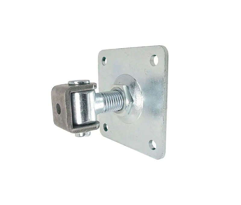 A hinge with integrated screw-mounting plate for straightforward installation on metal gate posts.